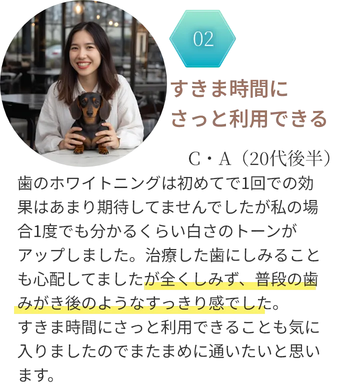 A.ありません。美歯口ホワイトニングは施術後すぐに飲食が可能です。デートやカフェの予定があっても気にせずに受けることができます。