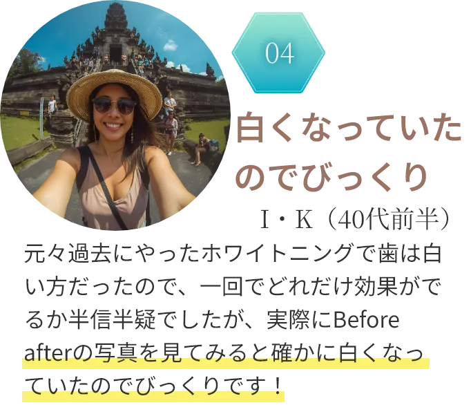 A.個人差はありますが、1回の施術でも変化を実感される方が多いです。続けていただくと汚れがつきにくくなり、より自然で明るい白さを感じやすくなります。